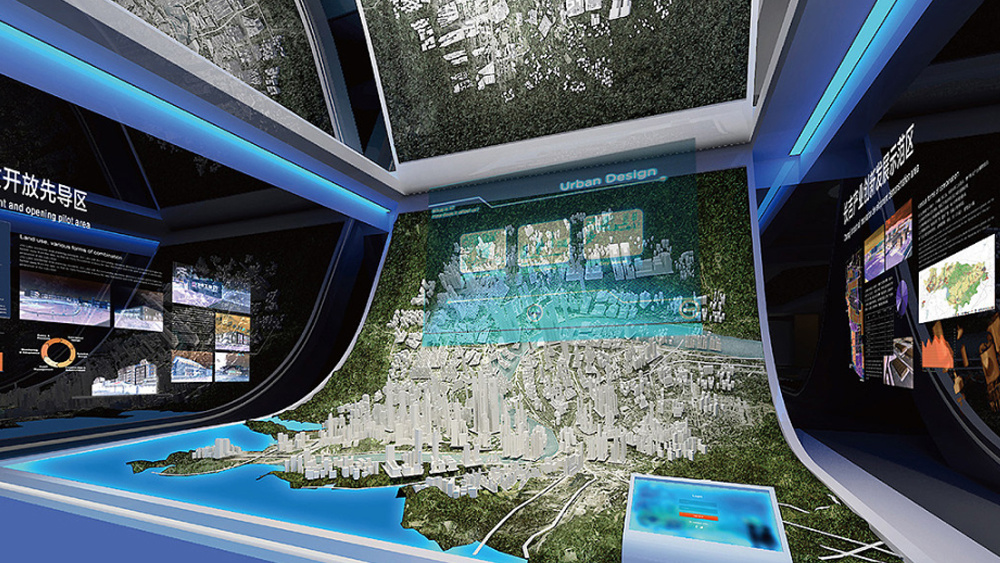 作为展馆视觉系统的核心组成部分,L型沉浸空间凭借垂直向度的立体延伸设计,塑造出具有强烈纵深感的展示环境。这一打破平面局限的空间结构,自然引导观众视线沿曲面流转,最终落于核心信息展区。在展示方式上,L幕进一步融合动态光影效果与多媒体交互技术。依托可编程控制的智能灯光系统,可实现随展示内容实时变化的亮度与色彩调控,结合3D投影映射技术,在幕墙表面形成丰富流动的光影图像,增强视觉表现力与科技感。
