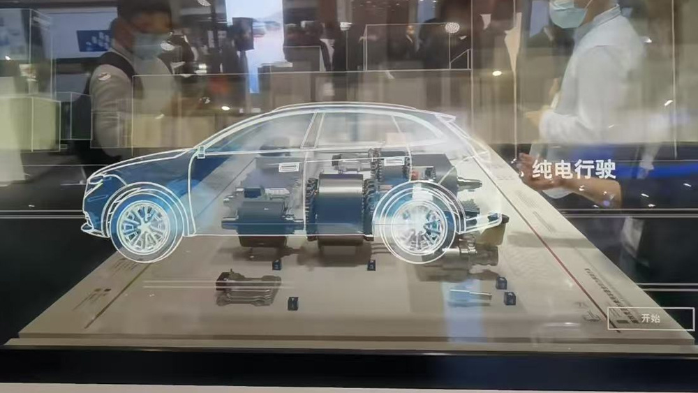 最终效果:于是,观众会看到绚丽的影像仿佛悬浮在玻璃中间,并且背景的实物(如产品、沙盘模型)依然清晰可见,形成一种虚实结合的“全息”视觉效果。